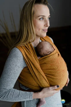 En coton, cette écharpe aux douces couleurs automnales jaune moutarde est parfaite pour porter bébé en toute circonstance !