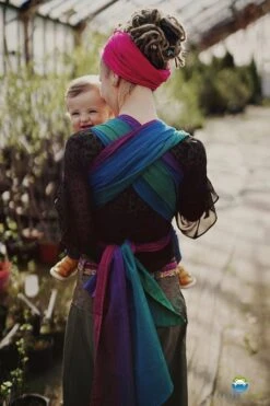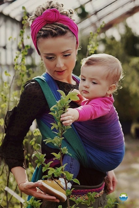 En coton, cette écharpe dans les vert, bleu, violet est parfaite pour porter bébé en toute circonstance!