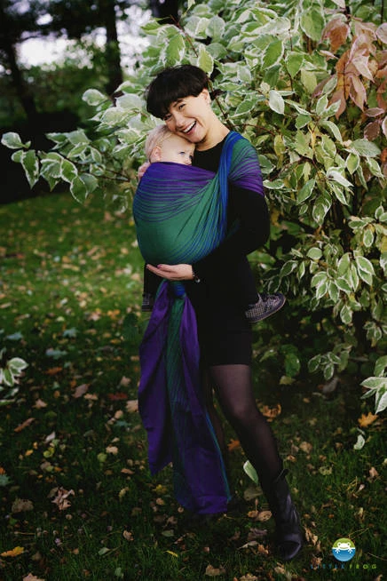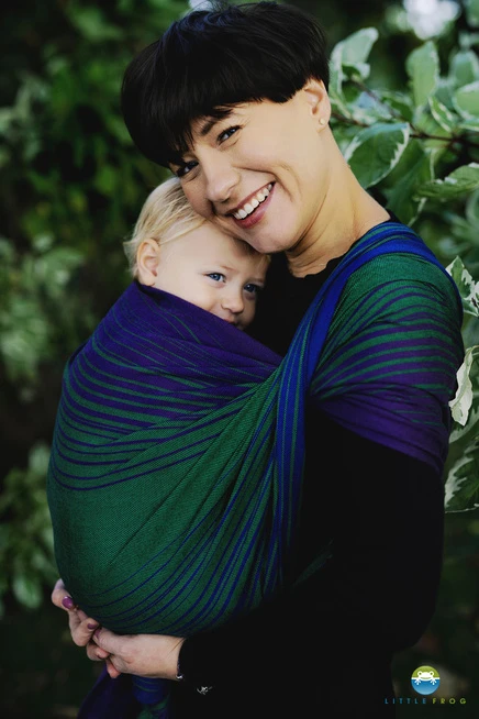 En coton, cette écharpe est parfaite pour porter bébé en toute circonstance ! Elle offre de jolies couleurs dans les tons de violet, vert et bleu