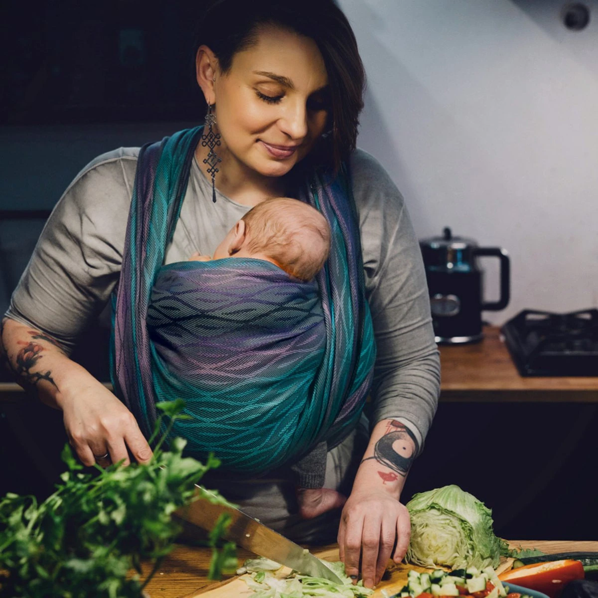 Cette splendide écharpe de portage Little Frog vous accompagnera au quotidien pour garder votre bébé auprès de vous. Le motif Flames of Love reprend des teints bleutés, violets et noirs dans un magnifique ensemble en jacquard.