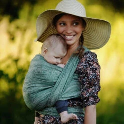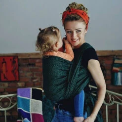 Le tissu jacquard en coton de ce modèle Carbon Harmony ajoute les motifs au cœur même du tissage. Les motifs sont agréables à regarder. Il existe aussi en version colorée et en écharpe de portage avec le modèle Rainbow Harmony.
