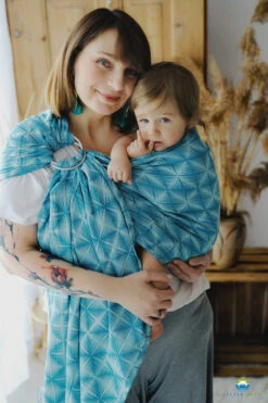 The Azure Glimmer ring sling ring sling in jacquard weave will work perfectly for carrying babies and toddlers.. It is woven from combed cotton and is soft from the first use, plus it has both edges in different colours for easy use. Ring Slings are quick to put on, making them accessible to every parent. Simply pull the fabric through the sewn-in rings as instructed, tighten accordingly and you are ready to go! When folded, ring slings take up little space, so they are easy to carry and store, which is important, especially when travelling.