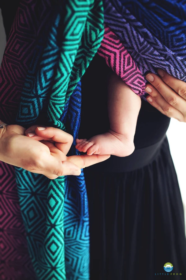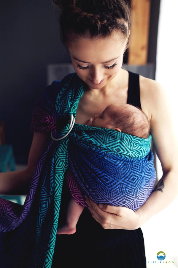 The Dark Aurora Cube ring sling in jacquard weave will work perfectly as the first ring sling for carrying babies and toddlers. It is woven from combed cotton and is soft from the first use, plus it has both edges in different colours for easy use. Ring Slings are quick to put on, making them accessible to every parent. Simply pull the fabric through the sewn-in rings as instructed, tighten accordingly and you are ready to go! When folded, ring slings take up little space, so they are easy to carry and store, which is important, especially when travelling.