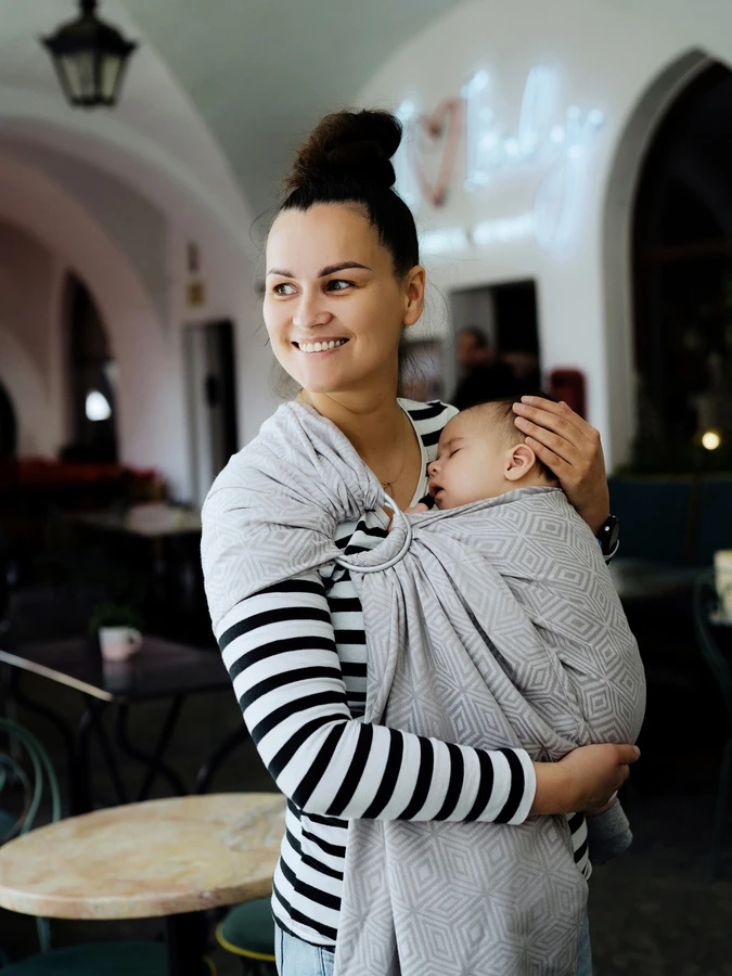The Grey Cube ring sling in jacquard weave will work perfectly as the first ring sling for carrying babies and toddlers. It is woven from combed cotton and is soft from the first use. Ring Slings are quick to put on, making them accessible to every parent. Simply pull the fabric through the sewn-in rings as instructed, tighten accordingly and you are ready to go! When folded, ring slings take up little space, so they are easy to carry and store, which is important, especially when travelling.