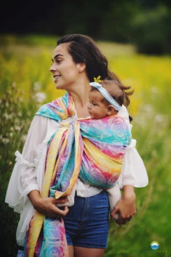 The Linen Flower Bloom ring sling ring sling in jacquard weave will work perfectly for carrying babies and toddlers. It is woven from combed cotton with blend of linen yarn to increases the comfort of wearing (especially for older children) and makes the sling more breathable, especially on hot days, plus this sling has both edges in different colours for easy use. Ring Slings are quick to put on, making them accessible to every parent. Simply pull the fabric through the sewn-in rings as instructed, tighten accordingly and you are ready to go! When folded, ring slings take up little space, so they are easy to carry and store, which is important, especially when travelling.