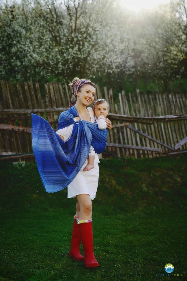 The Sapphire ring sling in broken twill weave will work perfectly as the first ring sling for carrying babies and toddlers. It is woven from combed cotton and is soft from the first use, plus it has both edges in different colours for easy use. Ring Slings are easy to use, making them accessible to every parent. Simply pull the fabric through the sewn-in rings as instructed, tighten accordingly and you are ready to go! When folded, ring slings take up little space, so they are easy to carry and store, which is important, especially when travelling.