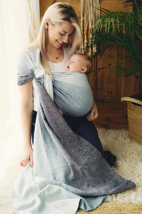 The Rocky Cube ring sling in jacquard weave will work perfectly as the first ring sling for carrying babies and toddlers. Fabrics with TENCEL™ fibre are ideal for summer. They are breathable, slightly slippery and very soft. Fabric with TENCEL™ regulates body temperature, absorbs moisture, is anti-allergenic and extremely durable and long-lasting.
